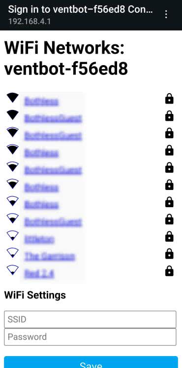 Ogólny plik konfiguracyjny oprogramowania układowego Ventbot nie zna SSID i hasła Wi-Fi. Jednym ze sposobów konfiguracji tego jest dodanie poświadczeń Wi-Fi do pliku konfiguracyjnego (np. za pomocą pliku secrets.yaml). Można w ten sposób również skonfigurować statyczny adres IP. Jeśli chcemy to zrobić, to prawdopodobnie trzeba również zmodyfikować plik ventbot.yaml.inc.