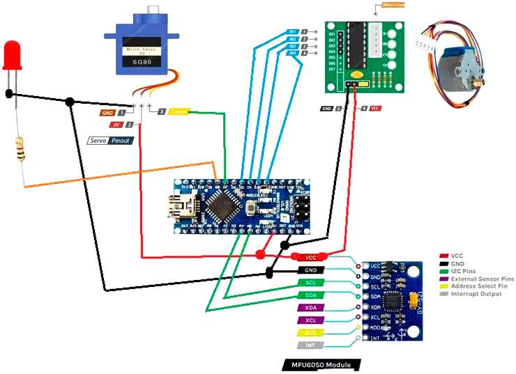 Akcelerometr MPU6050 podłączony jest do wejść SDA i SCL płytki Arduino, czyli do pinów A4 (SDA) i A5 (SCL). Wejście sterowania serwomotoru znajduje się na wyprowadzeniu D7, natomiast wyprowadzenia D2, D3, D4, D5 łączą się ze sterownikiem silnika ULN2003. Dioda LED podłączona jest poprzez opornik 470 Ω do wyprowadzenia D8 płytki Arduino. Podłączenie diody LED, która wskazuje, kiedy silnik krokowy jest włączony, jest opcjonalne.