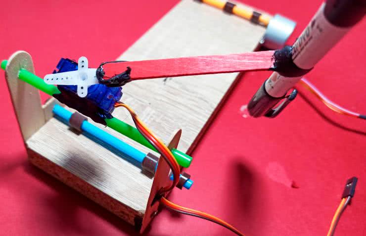 Drugi silnik – widoczny na fotografii 2, odpowiedzialny jest za przemieszczanie pisaka. Do serwomotoru przymocowany jest pisak, za pomocą prostego drewnianego patyczka do lodów. Ruch serwomotoru powoduje przemieszczanie się pisaka w poprzek taśmy – ta oś to natężenie drgań ziemi.