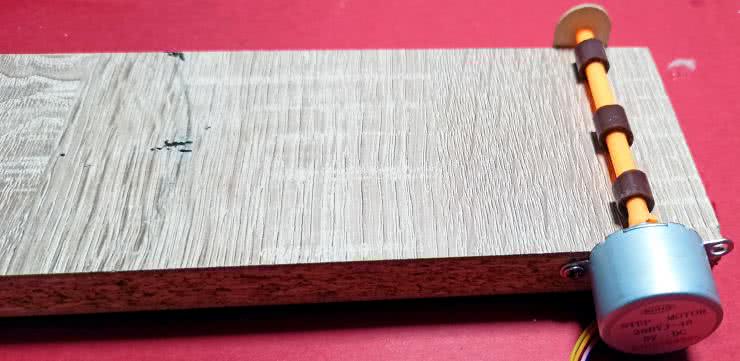 Podstawą urządzenia jest fragment płyty meblowej. Przymocowane są do niej dwie osie wykonane z plastikowych rurek, na które nałożono fragmenty gumowego węża (fotografia 1). Wąż ma zapewnić większe tarcie pomiędzy osią i papierową taśmą, dzięki czemu jest ona przesuwana i nie ślizga się. Jedna z osi jest napędzana silnikiem krokowym. Zastosowano tutaj silnik krokowy z uwagi na fakt, że łatwiej jest zapewnić jego stałe, wolne obroty niż zwykłego silnika prądu stałego – układ nie ma enkodera obrotowego itp., więc nie ma innej możliwości stabilizowania obrotów, od których zależy prędkość przesuwu taśmy. Musi ona być cały czas stała, gdyż w tej osi sejsmogramu reprezentowany jest czas.