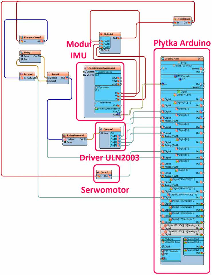 Wyjście funkcji mapującej steruje serwomotorem (Servo1) i podawane jest na komparator (CompareRange1), który wprawia w ruch silnik krokowy tylko wtedy, gdy wykryje sygnał z żyroskopu. Po 5 sekundach od ustania ruchu element opóźniający Delay1 resetuje Timer1, który odpowiedzialny jest za ruch silnika krokowego, podając impulsy z PulseGenerator1 na moduł sterujący Stepper1. W momencie, gdy Timer1 zostaje zresetowany, generator impulsów przestaje je generować w związku z czym silnik krokowy przestaje obracać się i przesuwać papier.