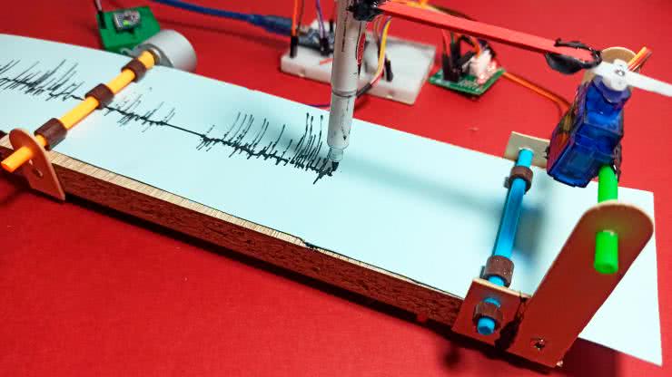 Konstrukcja układu jest bardzo prosta. Kluczowe elementy to elektroniczne sterowanie z płytką Arduino oraz mechaniczny układ do kreślenia sejsmogramu na papierze.