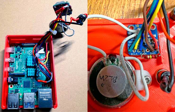 Za wyjście dźwięku odpowiada moduł, który zawiera scalony wzmacniacz z wejściem I²S - układ MAX98357 - do którego podłączony jest głośnik. Można też po prostu podłączyć zestaw słuchawkowy czy inny odbiornik audio do wyjścia audio z gniazdem jack 3,5 mm w Raspberry Pi. Wejście głosowe realizowane jest przez mikrofon cyfrowy dołączony do portu USB.