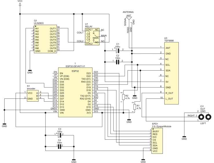 Całość zasilana jest z zewnętrznego zasilacza 5 V (gniazdo USB). Kondensatory C1, C2, C3, C4 służą do filtrowania napięcia zasilającego. Rezystory R1 i R2 podciągają szynę I²C do napięcia 3,3 V. Zarówno do tunera, mikrokontrolera, jak i wyświetlacza podane jest napięcie 5 V (moduł tunera ma wewnętrzny regulator napięcia na 3,3 V). Enkoder pobiera zasilanie z pinu 3,3 V na płytce mikrokontrolera ESP32.