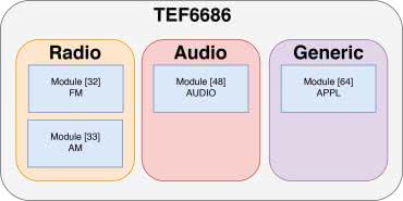 Komunikacja z układem tunera odbywa się przez przesyłanie danych na magistralę I²C za pomocą standardowej biblioteki Wire.h. Z dokumentacji układu TEF6686 wynika, że zawiera on 4 logiczne moduły: FM, AM, AUDIO, APPL (rysunek 1). Każdy z nich ma przypisany identyfikator. W zależności od wywoływanej funkcji musimy każdą komendę adresować do odpowiedniego logicznego modułu.