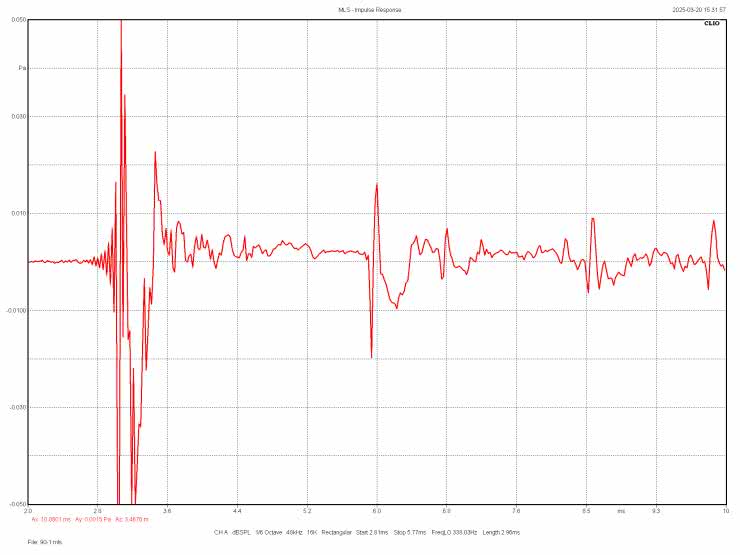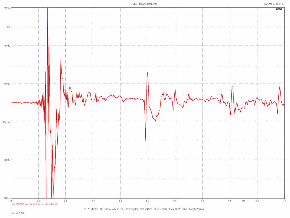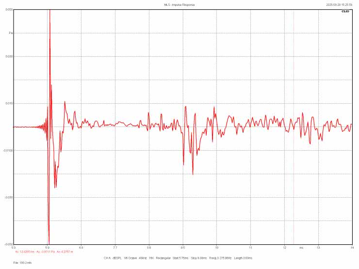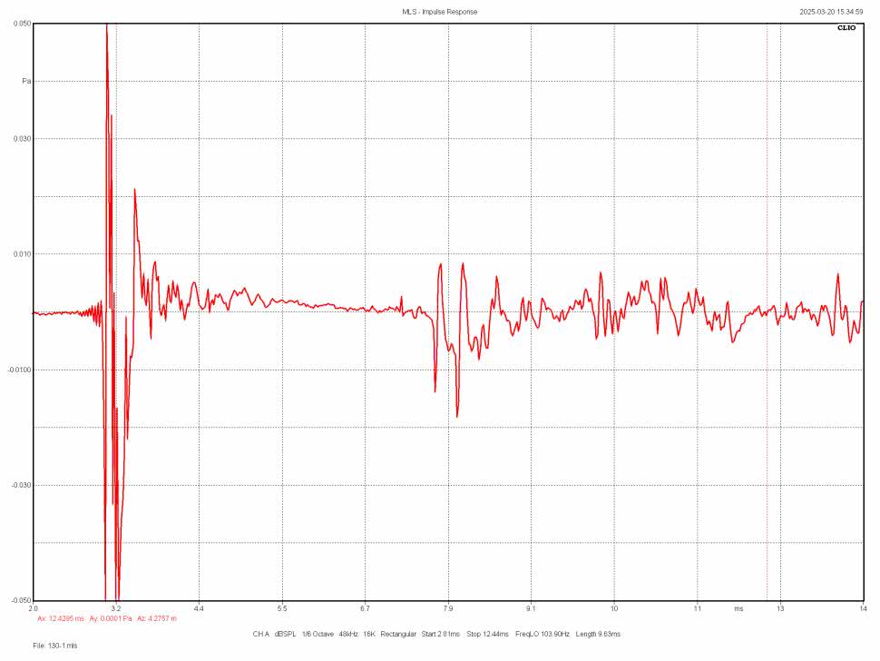 Załóżmy, że głośnik/zespół głośnikowy (na razie potraktujmy go umownie jako punktowe źródło dźwięku) znajduje się na wysokości 0,9 metra i na tym samym poziomie znajduje się mikrofon, w odległości 1 m od głośnika; długość drogi fali odbitej od podłogi wynosi wtedy 2,12 m, różnica dróg – 1,12 m; taką drogę fala (o dowolnej częstotliwości, prędkość dźwięku jest taka sama dla wszystkich częstotliwości, w powietrzu o temperaturze pokojowej i typowej wilgotności wynosi 344 m/s) przebywa w ok. 3 ms. W takiej „odległości” od pierwszego impulsu fali bezpośredniej można spodziewać się na pomiarze śladu fali odbitej. Do dyspozycji mamy kursor, którym możemy odznaczyć na wykresie początek i koniec fragmentu odpowiedzi impulsowej, który chcemy brać pod uwagę dla dalszych operacji.