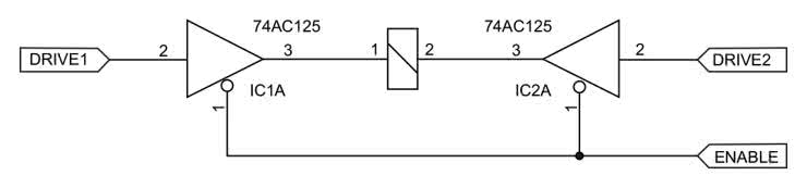 Takimi elementami można sterować wprost z wyprowadzeń bufora trójstanowego, na przykład popularnego 74AC125. Jego wydajność prądowa wynosi aż 24 mA, a ponadto układ ma wbudowane diody zabezpieczające na swoich wyjściach, więc dodatkowe elementy nie są konieczne. Za pewną wadę można uznać niepomijalne napięcia przewodzenia (zwłaszcza w stanie wysokim), więc do zasilania polecam nieco wyższe napięcie, na przykład 5,3…5,5 V. Wtedy jeden taki układ scalony w pełni obsługuje dwa przekaźniki, dając możliwość całkowitego odłączenia cewki od zasilania. Przykładowe połączenie znajduje się na rysunku 5.