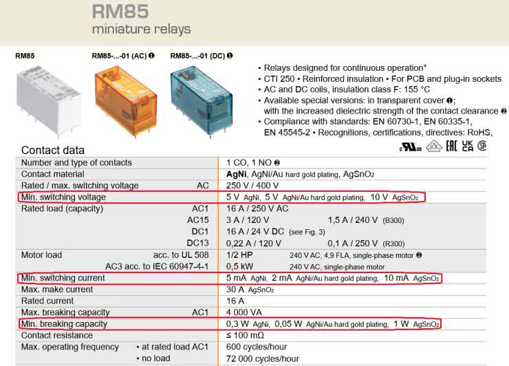 Pierwszą z nich, której (przyznaję) sam się nie trzymałem w początkach swojej elektronicznej działalności, jest stosowanie przekaźników sygnałowych w torze sygnałowym. Typowe przekaźniki elektromagnetyczne, dostępne za symboliczne „2 złote”, mają określony minimalny prąd przewodzenia i/lub napięcie między stykami – rysunek 1. Chodzi o to, by powstające iskrzenie cyklicznie usuwało warstwę osadzających się tlenków, siarczków i innych trudno przewodzących zanieczyszczeń. Jeżeli parametry te nie są spełnione – czyli przekaźnik nie operuje odpowiednio wysoką mocą przełączaną – jakość styku się pogarsza: rośnie rezystancja i pojawiają się trzaski. Dotyczy to zwłaszcza przekaźników o otwartej, nieuszczelnionej obudowie. Miałem taką sytuację lata temu, więc nie polecam opisywanego rozwiązania.