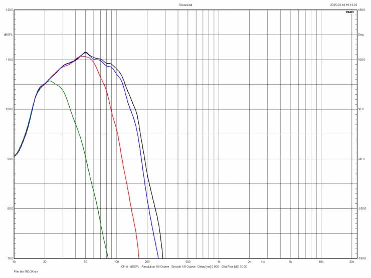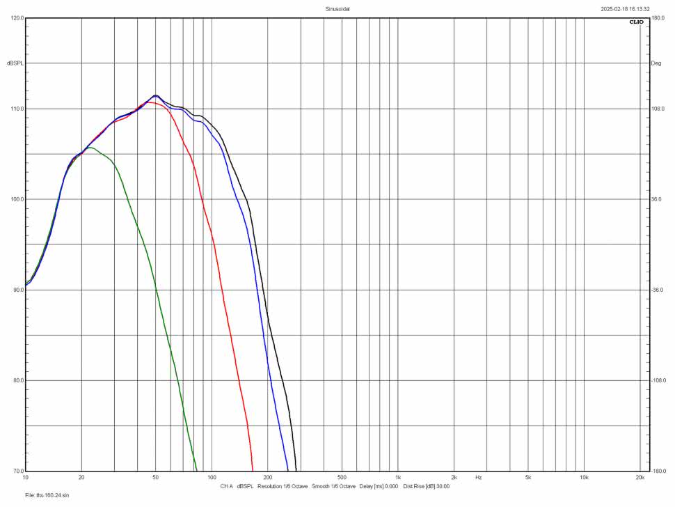 Perlisten R18 to subwoofer z bardzo dużym, 18-cm głośnikiem w obudowie zamkniętej. Chociaż subwoofer przetwarza z założenia tylko bardzo niskie częstotliwości, to przy tak dużym głośniku (i obudowie) należy spodziewać się, że korekta baffle-step zmieni kształt charakterystyki przy niskich częstotliwościach i dlatego należy ją przeprowadzić. Jednak wyniki pomiarów sugerują, że można ją… pominąć. Na rysunku 19 widzimy cztery charakterystyki dla trzech teoretycznych częstotliwości filtrowania – wg oznaczeń firmowych dla skrajnych 30 Hz (zielona) i 160 Hz (niebieska), pośrednich 80 Hz (czerwona) i dodatkowa 160 Hz z korekcją baffle-step (czarna); wszystkie w trybie THX, z nachyleniem filtra 24 dB/okt. W rzeczywistości spadek –6 dB (względem szczytu określonej charakterystyki) możemy przesuwać (na prawym zboczu) od 35 Hz do 120 Hz (odczyt z korektą baffle-step), a bez tej korekty odczytalibyśmy ok. 130 Hz. Różnica nie jest więc znacząca, na skutek dużego nachylenia zbocza, a mało istotna również dlatego, że w badaniu subwooferów bardziej interesuje nas dolna częstotliwość graniczna, a ustalenie górnej jest tylko orientacyjne, i tak wymagając zgrania na podstawie pomiarów całego systemu.
