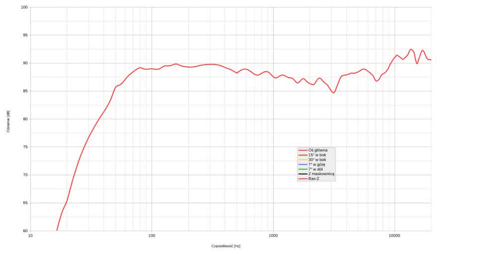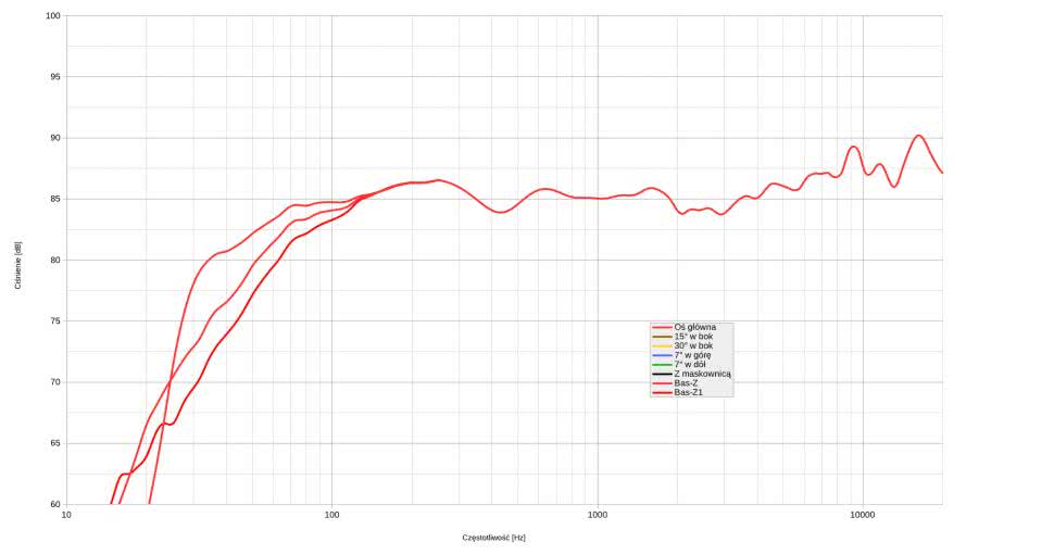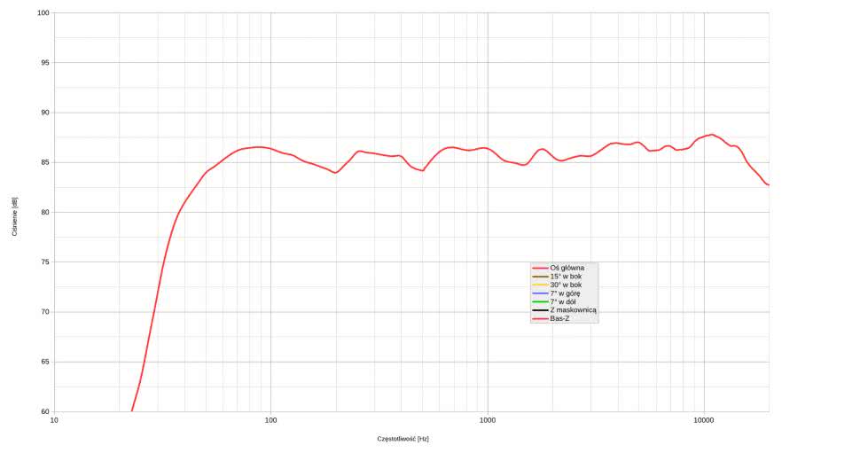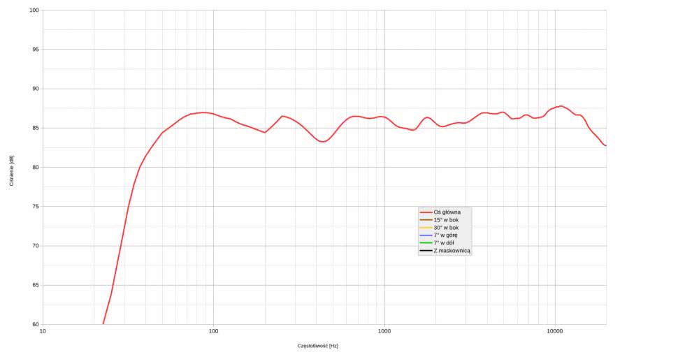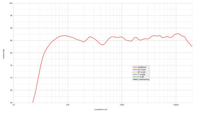 Paradigm Founder 100F to układ trójdrożny, z trzema 18-centymetrowymi przetwornikami niskotonowymi i podobnej wielkości głośnikiem średniotonowym. Wszystkie trzy niskotonowe są tak samo filtrowane i pracują w jednej komorze bas-refleks (tutaj nie ma co do tego wątpliwości, bo tunel jest jeden), stąd ich charakterystyki są na tyle do siebie podobne, że można zmierzyć jeden głośnik, a nie wszystkie trzy, aby uzyskać charakterystykę reprezentującą całą sekcję. Oczywiście kwestia właściwego poziomu pozostaje na razie otwarta – na tym etapie zajmujemy się ustalaniem kształtu charakterystyki. Pomiar charakterystyki z tunelu stawia jednak przed nami nowe pytanie: otwór znajduje się w dolnej ściance, ciśnienie uchodzi przez odpowiednio wysoki prześwit stworzony przez nóżki; gdzie powinniśmy przystawić mikrofon? Przede wszystkim nie powinniśmy kolumny kłaść ani pochylać, aby umieścić mikrofon w samym wylocie tunelu ani w jego wnętrzu. O ile zalecamy takie działanie w przypadku otworów znajdujących się na tylnej, a tym bardziej na przedniej ściance (aby zmniejszyć wpływ ciśnienia od głośników), o tyle w tym przypadku powietrze znajdujące się w prześwicie może być częścią masy drgającej układu rezonansowego (razem z masą powietrza w tunelu), należy więc utrzymać taką konfigurację; odchylenie obudowy odkleiłoby tę masę i zmieniło częstotliwość rezonansową układu. Możemy za to mikrofon wsunąć pod obudowę, analogicznie jak wkładamy go do tunelu w innych przypadkach – jak już sprawdziliśmy w poprzednim odcinku, charakterystyka będzie podobna bez względu na to, w jakim miejscu tunelu będzie znajdował się mikrofon; ważne, aby nie zmieniać warunków działania układu.