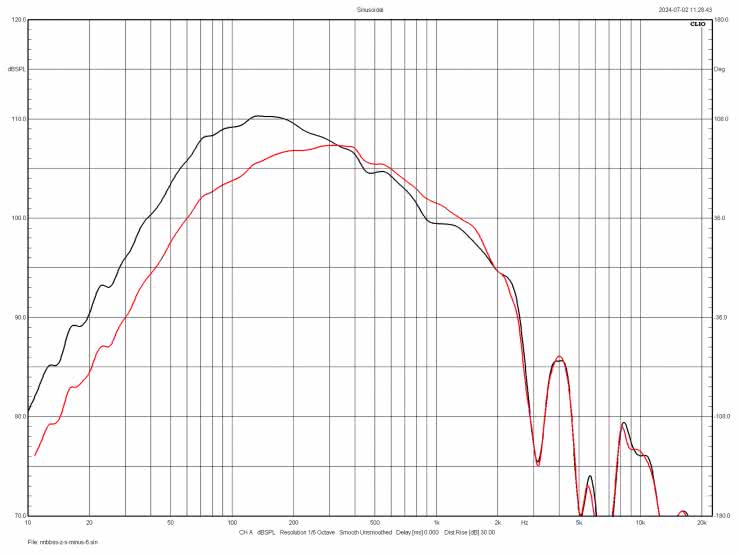 Teoretycznie, dla uzyskania najdokładniejszych wyników, charakterystykę każdego ze źródeł (jeszcze przed kolejnymi operacjami) powinniśmy indywidualnie poddawać korekcie baffle-step, ale byłoby to bardzo pracochłonne; z dopuszczalnym błędem można poddać korekcie charakterystykę wypadkową (definiując w systemie, że źródło promieniowania znajduje się pomiędzy obydwoma głośnikami). Charakterystykę wypadkową zespołu przed korektą (czarna) i po niej (czerwona) widzimy na rysunku 4.