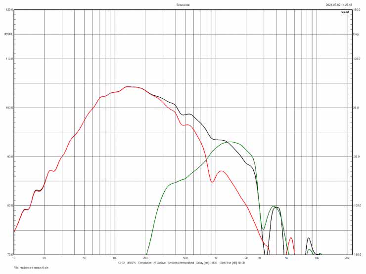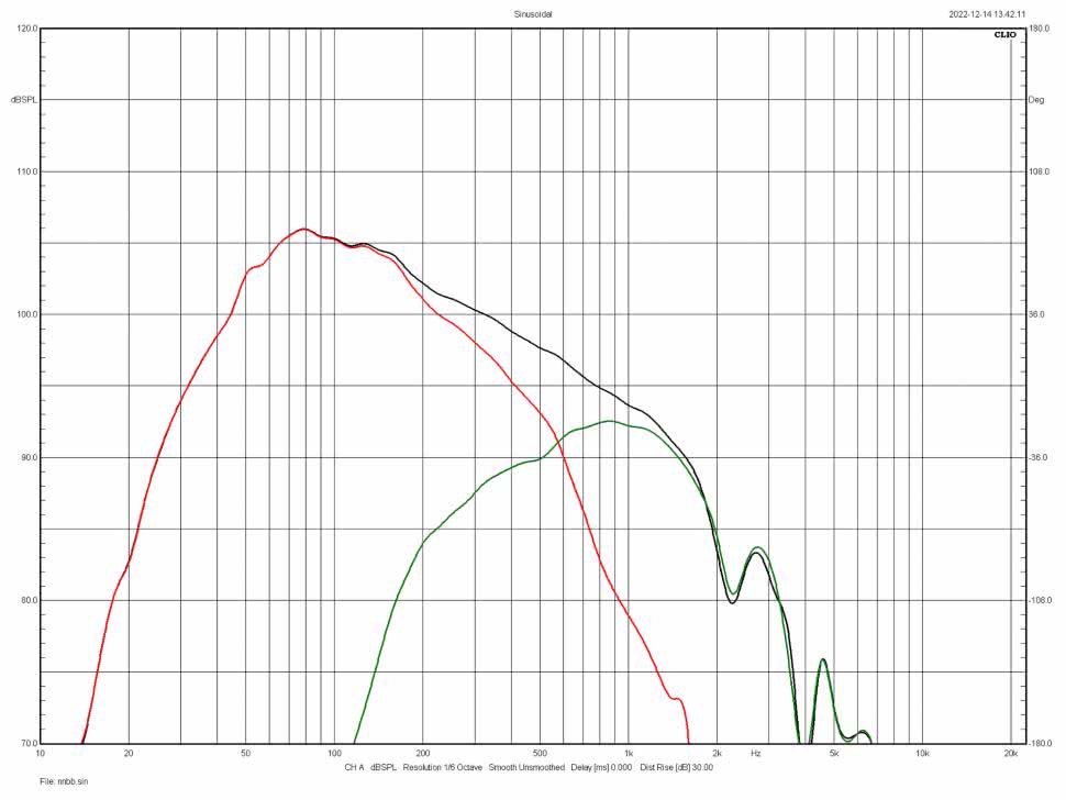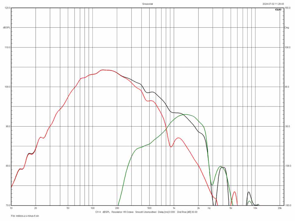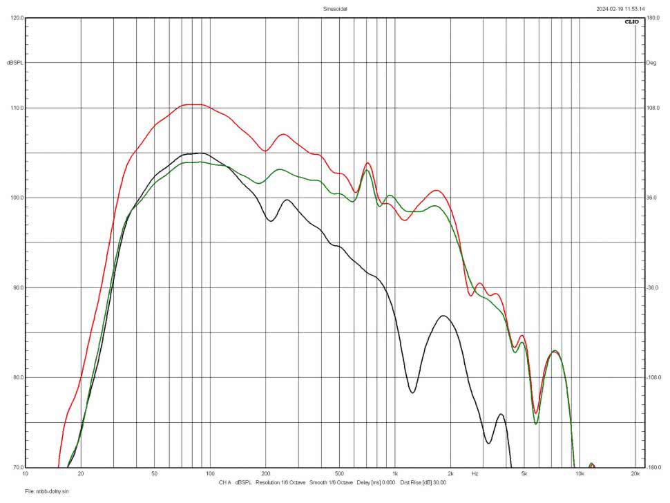 W takiej sytuacji, chcąc wyznaczyć wypadkową charakterystykę całego zespołu w zakresie niskich częstotliwości, w następnym kroku możemy dodać do siebie charakterystyki wypadkowe tych sekcji, albo najpierw dodać do siebie charakterystyki głośników, podobnie postępując z charakterystykami z tuneli (pamiętając jednak zawsze o skorygowaniu ich poziomu względem poziomu odpowiadających im głośników) i na końcu dodając te charakterystyki wypadkowe (głośników i tuneli) – wynik będzie taki sam. Charakterystykę wypadkową zespołu (czerwoną), jako sumę charakterystyk sekcji górnej (nisko-średniotonowej – zielona) i dolnej (niskotonowej – czarna), pokazujemy na rysunku 3.