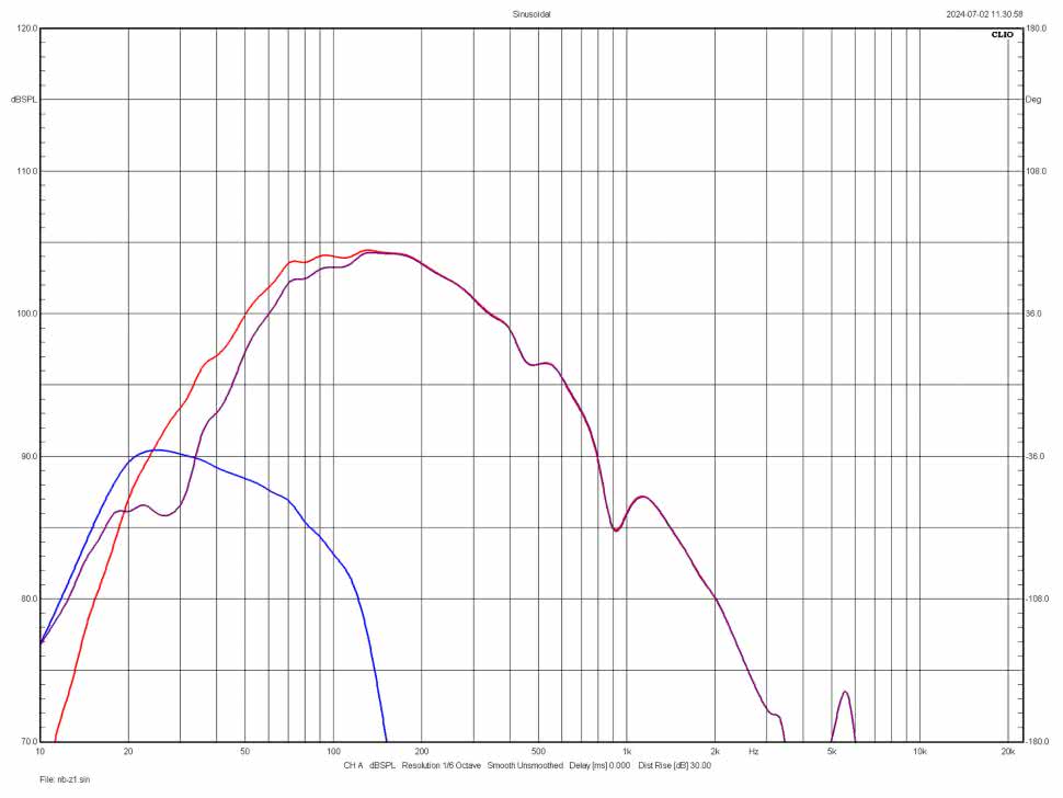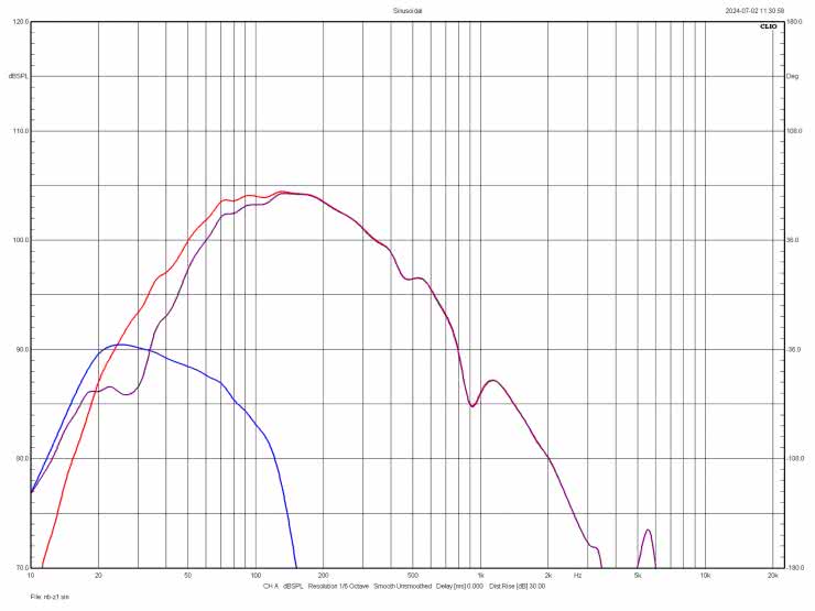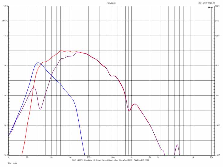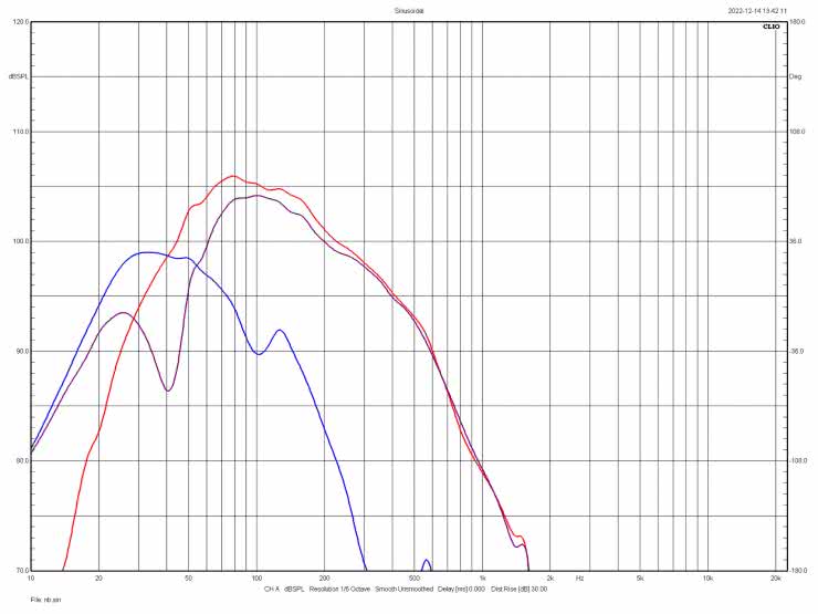 W pomiarach Gold 300 G6 robimy jednak wspomniane założenia upraszczające. Do dalszych operacji bierzemy pomiar tylko jednego głośnika niskotonowego jako dobrze reprezentującego charakterystykę obydwu, chociaż decyzję o tym podejmujemy dopiero po wstępnym pomiarze przetworników niskotonowych (sprawdzając, czy nie różnią się zbytnio); podobnie robimy w przypadku tuneli. W pierwszym podejściu obydwa promieniują (żadnego nie zamykamy) i po skorelowaniu poziomów uzyskujemy wyniki widoczne na rysunku 13. Obudowa (bas-refleks) dostrojona jest do 32 Hz, odciążenie na charakterystyce głośnika (fioletowa) wyraźne, szczyt charakterystyki z otworu (niebieska) też ostry i wysoki, dzięki czemu charakterystyka wypadkowa (czerwona) aż do tej częstotliwości opada łagodnie, a dopiero poniżej (gdzie fazy promieniowania głośników i otworów są niemal przeciwne) – z dużym nachyleniem. W obudowie nie powstają fale stojące, które miałyby wpływ na charakterystykę czy to głośników, czy otworów.