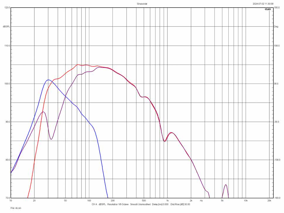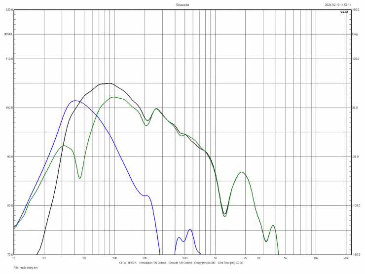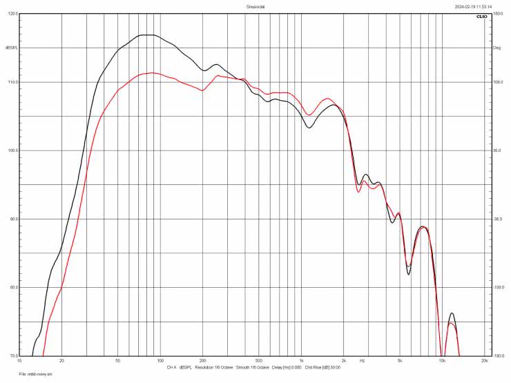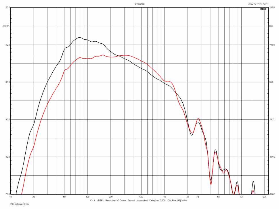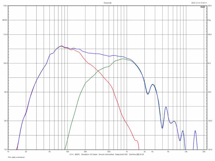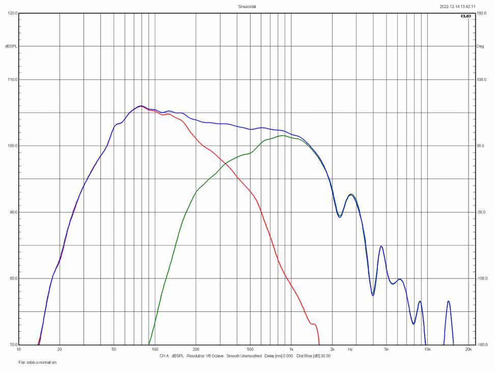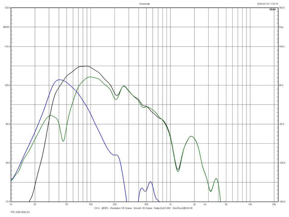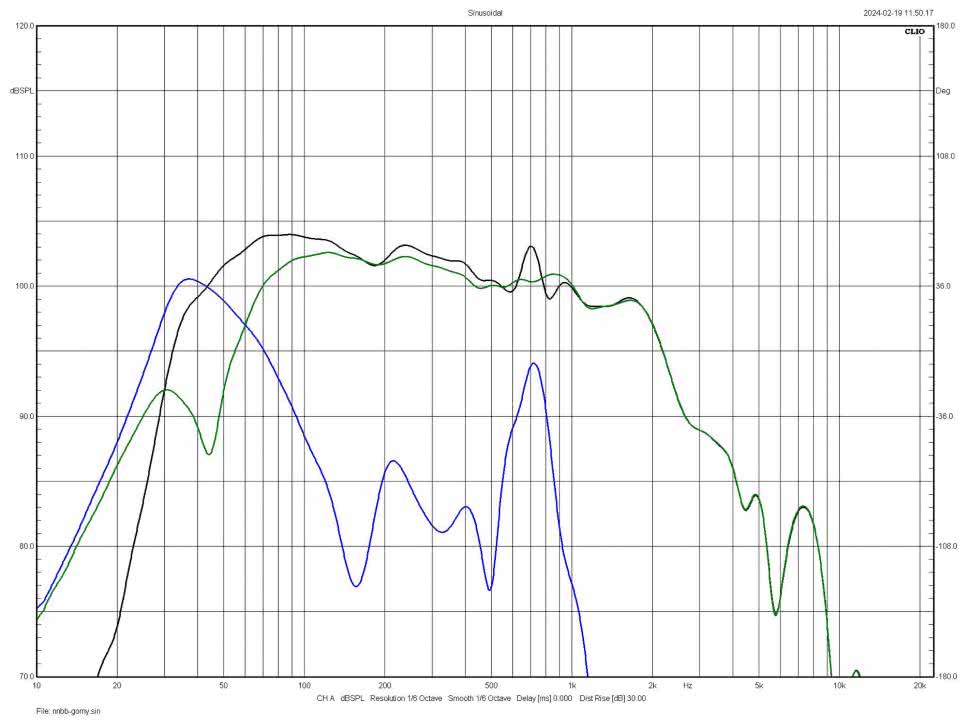 Wreszcie dołączamy tę charakterystykę do charakterystyki w zakresie średnio-wysokotonowym, zmierzonej metodą MLS. 18-centymetrowy głośnik ma membranę o średnicy 12,5 cm, co zgodnie ze wzorem opisanym w poprzednim odcinku: