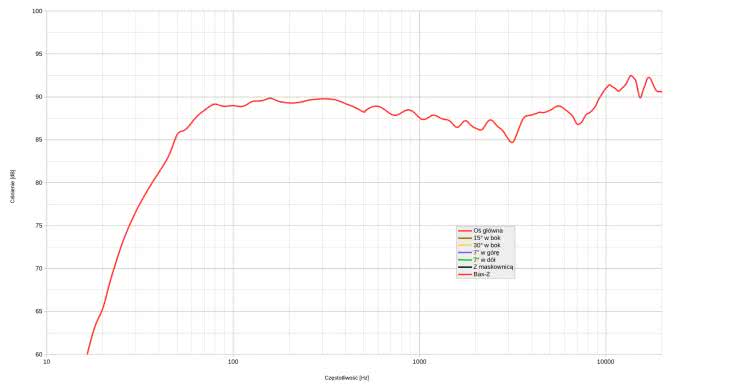 Częstotliwość podziału zgadza się z informacjami producenta (800 Hz). Charakterystyka wypadkowa (czarna) nie jest jeszcze poddana korekcji baffle-step, którą widzimy na rysunku 16 (przed korektą – czarna, po korekcie – czerwona).