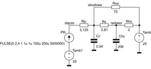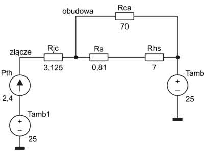 Jak pisaliśmy wyżej, produkowana moc, przenoszona jako ciepło, to w elektrycznej analogii płynący prąd. Dlatego też tranzystor ten, jako źródło ciepła, modelujemy, jako źródło prądowe. Załóżmy, że spadek napięcia na tranzystorze wynosi 0,6 V, a płynie przez niego prąd równy 4 A, co daje Pth=2,4 W.