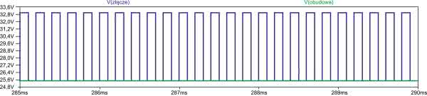 Oznacza to przebieg prostokątny o wartości równej 0 (w stanie 1) i 2,2 (w stanie 2), który uruchomi się z opóźnieniem 1 s. Czas narastania i opadania zdefiniowano, jako 1 μs, a okres impulsu 200 μs, co daje częstotliwość przełączana równą 5 kHz. Wypełnienie impulsu równe jest 50% (impuls załączony ma być przez 100 μs – połowę z okresu). Impuls powtórzyć ma się 5 milionów razy, co w naszym przypadku (symulacja trwać będzie krócej) oznacza nieskończony ciąg impulsów.