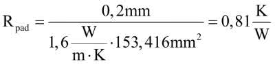 Na przykład, jeśli chcemy obliczyć przewodność cieplną przekładki termicznej, mocowanej np. na tranzystorze, to uwzględniamy jej pole powierzchni (w przypadku elementu w obudowie TO-220 jest to 10,16×15,1 mm=153,416 mm2), a następnie jej grubość, np. 0,2 mm. Przewodność cieplna podkładki silikonowej firmy 3M wynosi 1,6 W/(m×K) (dla typu 3M 5514). Rezystancja cieplna tej podkładki wynosi, zatem: