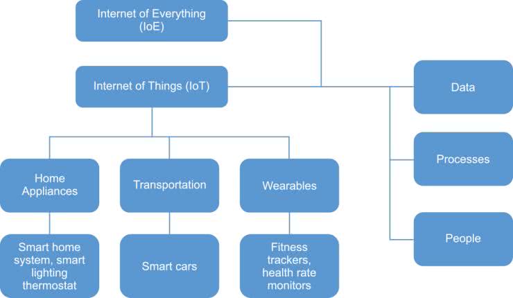 - Ludzie są najważniejszym elementem IoE – korzystają z wyników działania sprzętu i oprogramowania, co pomaga im szybko rozwiązywać problemy i podejmować decyzje. Dostosowują oprogramowanie do swoich wymagań i decydują o zadaniach wykonywanych przez sprzęt. Jednocześnie udostępniają swoje spostrzeżenia i potrzeby za pośrednictwem stron internetowych i aplikacji. Dodatkowo urządzenia, z których korzystają (np. smartfony lub urządzenia do monitorowania kondycji i zdrowia), dostarczają wielu danych o ich sposobie życia.