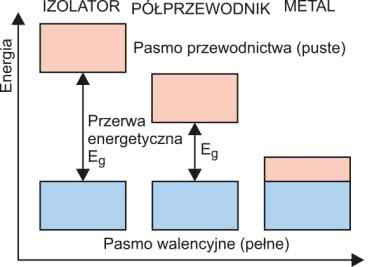 Odległość pomiędzy pasmem walencyjnym a przewodnictwa nazywana jest przerwą energetyczną (Eg) lub pasmem wzbronionym, ponieważ żaden elektron nie może się tam znaleźć, tj. nie może mieć energii, która przypadałaby na ten zakres. Jeśli odległość pomiędzy pasmami przewodnictwa a walencyjnym jest niewielka, mamy do czynienia z półprzewodnikiem (rysunek 1, środkowa konfiguracja). W większości literatury przyjmuje się za maksymalną wartość przerwy energetycznej 4 eV. Ścisła definicja mówi, że półprzewodnik to materiał o średniej wielkości, niezerowym pasmie wzbronionym, który zachowuje się jak izolator w temperaturze 0 K, ale umożliwia termiczne wzbudzenie elektronów do pasma przewodnictwa w temperaturach poniżej temperatury topnienia tego materiału.