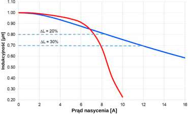 Prąd nasycenia DC zależy również od temperatury, nie tylko materiału magnetycznego induktora oraz struktury jego rdzenia. Różne struktury i rdzenie magnetyczne mogą wpływać na ISAT. Najczęściej spotykane są rdzenie ferrytowe, które charakteryzują się tzw. twardą krzywą nasycenia (czerwona krzywa na rysunku 5). Ważne jest, aby cewka nie pracowała poza punktem przegięcia krzywej, gdzie indukcyjność spada szybko.