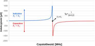 Cewka indukcyjna ma charakterystykę (pokazaną, jako niebieska część krzywej na rysunku 8) aż do częstotliwości rezonansowej (fR), ponieważ rosnąca częstotliwość odpowiada wyższej impedancji. Przy częstotliwości rezonansowej ujemna reaktancja pojemnościowa (XC) jest równa dodatniej reaktancji indukcyjnej (XL), oszacowanej przez warunek w równaniu: