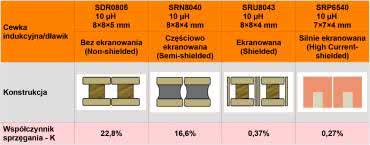 W dzisiejszych czasach, postępująca miniaturyzacja wymaga projektowania bardzo kompaktowych układów, gdzie położone blisko siebie elementy mogą ze sobą oddziaływać. Sprawia to, że problem sprzęgania się pola magnetycznego z otaczającymi elementami jest bardzo wyraźny. Na szczęście w handlu dostępne są cewki zintegrowane z ekranem magnetycznym. Na rysunku 9 pokazano przykładowe cewki firmy Bourns wraz z schematycznie narysowanym przekrojem. Na rysunku pokazano także współczynnik sprzęgania K – dla nieekranowanej cewki wynosi on niemalże 23%, a dla w pełni ekranowanej cewki poniżej pół procenta.