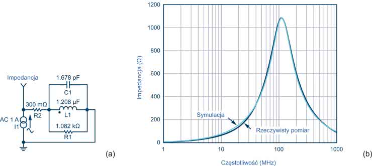 Równanie 2 daje wartość pojemności pasożytniczej CPAR = 1,678 pF. Rezystancję stałoprądową RDC, która wynosi 300 mΩ, można odczytać z karty katalogowej. Rezystancja dla prądu przemiennego RAC to szczytowa impedancja, przy której koralik wydaje się czysto rezystancyjny. Wartość RAC można obliczyć, odejmując RDC od zmierzonej wartości Z. Ponieważ RDC jest bardzo małe w porównaniu z impedancją szczytową, można ją pominąć. Dlatego w tym przypadku RAC wynosi 1,082 kΩ. Po uzyskaniu wszystkich wartości można podstawić je do modelu (rysunek 5), a następnie zasymulować je w dowolnym pakiecie. Wyniki takiej symulacji wykonane w ADIsimPE zaprezentowane są na charakterystyce z rysunku 5. Do wykresu dodano również przebieg zmierzonej krzywej, aby podkreślić wysoką zbieżność.