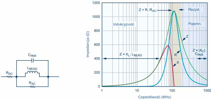 Charakterystyka koralika ferrytowego jest podzielona na trzy obszary odpowiedzi: indukcyjny, rezystancyjny i pojemnościowy. Regiony te można określić, patrząc na wykres Z, R i X (pokazane na rysunku 4), gdzie Z to impedancja, R to opór, a X to reaktancja koralika. Aby zredukować szum wysokiej częstości, koralik musi znajdować się w obszarze rezystancyjnym. Wtedy element ten działa jak rezystor, który tłumi szumy o wysokiej częstotliwości i rozprasza je w postaci ciepła. Obszar rezystancyjny występuje powyżej częstotliwości rozgraniczającej (gdzie X = R) i do momentu, w którym koralik przyjmuje charakter pojemnościowy. Ten punkt pojemnościowy występuje przy częstotliwości, w której bezwzględna wartość reaktancji (–X) jest równa rezystancji (–X = R).