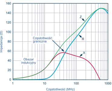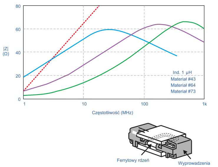 Niektóre ferryty, nawet zanim nastąpi pełne nasycenie, mogą zachowywać się nieliniowo. Dlatego też, jeśli wymagany jest stopień mocy przystosowany do pracy z niskim poziomem zniekształceń wyjściowych, należy koralik sprawdzić w prototypie, zwłaszcza to, jak działa w pobliżu obszaru nasycenia. Typowy przebieg impedancji koralików ferrytowych pokazano na rysunku 2. Kształt tej krzywej zależny jest od materiału rdzenia – ferrytu – jaki zastosowano do konstrukcji koralika. Linią przerywaną pokazano zależność impedancji dla idealnej indukcyjności 1 μH.