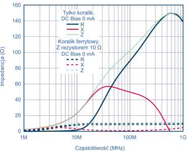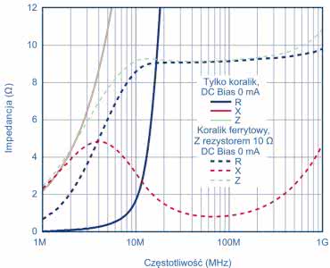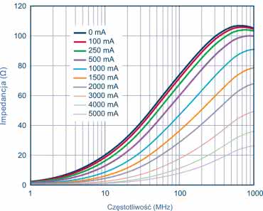 Koraliki ferrytowe nie zawsze są konieczne, ale zapewniają dodatkową izolację i filtrowanie zasilania od szumów o wysokiej częstotliwości, co jest często bardzo pożądane. Głównym problemem przy ich stosowaniu jest szansa ich nasycania, szczególnie w momencie, gdy zasilany układ pobiera spory prąd. Kiedy ferryt ulega nasyceniu, wtedy staje się nieliniowy i traci swoje właściwości filtrujące. Na rysunku 3 pokazano rodzinę krzywych – zależności impedancji od częstotliwości, dla tego samego elementu dla różnych prądów stałych, płynących przez element. Widać na nim, iż im wyższy prąd, tym impedancja jest niższa.