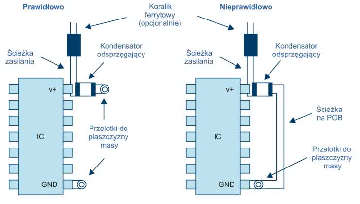 Filtrowanie szumów o niskiej częstotliwości zwykle wymaga kondensatorów elektrolitycznych (zazwyczaj o pojemności w zakresie od 1 μF do 100 μF), które działają jako magazyn ładunku dla prądów przejściowych o niskiej częstotliwości. Szum zasilania o wysokiej częstotliwości jest najlepiej redukowany za pomocą kondensatorów ceramicznych o niskiej indukcyjności, montowanych powierzchniowo, podłączonych bezpośrednio do styków zasilania układu scalonego (zwykle od 10 nF do 100 nF). Wszystkie kondensatory filtrujące muszą być podłączone bezpośrednio do wylewki masy o niskiej impedancji, aby skutecznie działały. Do tego połączenia wymagane są krótkie ścieżki lub przelotki, aby zminimalizować dodatkową indukcyjność szeregową ścieżek. Przykład takiego układu ścieżek pokazano na rysunku 1.