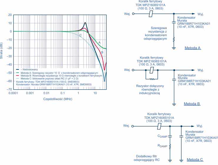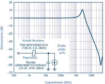 Punkt szczytowy rezonansu występuje, gdy częstotliwość rezonansowa filtra dolnoprzepustowego, utworzonego przez indukcyjność koralika ferrytowego i pojemność kondensatora o wysokim współczynniku dobroci, jest niższa od częstotliwości granicznej tego koralika. Powstały filtr jest słabo tłumiony. Rysunek 6 pokazuje wykres zmierzonej impedancji w funkcji częstotliwości dla koralika TDK MPZ1608S101A.