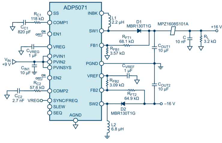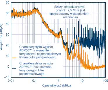 Na rysunku 8 zaprezentowano aplikację układu ADP5071 z zaimplementowanym filtrem z koralikiem ferrytowym, a rysunek 9 zawiera wykres widma sygnału na wyjściu dodatnim.