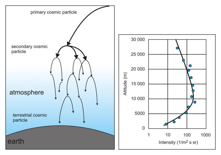 Zjawisko to zachodzi także w naszej atmosferze, w związku, z czym natężenie promieniowania kosmicznego zmienia się wraz z wysokością. Do wysokości około 10...15 tysięcy metrów nad poziomem morza dominuje zjawisko generacji nowych cząstek, podczas gdy na wyższych pułapach dominuje ich absorpcja. Na powierzchnię Ziemi dociera któraś z kolei generacja początkowego „pierwotnego kosmosu”. Zobrazowano to na rysunku 2a. Typowy strumień wynosi 20 neutronów na cm² na godzinę (na poziomie morza), jak pokazano na rysunku 2b. Z tego opisu można wywnioskować, że strumień ziemskich cząstek kosmicznych zależy od wysokości. Zależności od szerokości geograficznej, wynikające z wpływu ziemskiego pola magnetycznego i rzeczywistej aktywności Słońca, można pominąć przy oszacowaniu pierwszego rzędu.