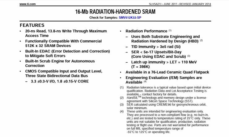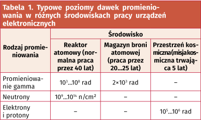 Na rysunku 5 pokazano fragment przykładowej karty katalogowej układu scalonego (w tym wypadku statycznej pamięci RAM) o zwiększonej odporności na promieniowanie. W karcie katalogowej podano TID – nie mniejsze niż 3×105 rad oraz częstotliwość występowania SER – poniżej 5×10–17 na bit, na dzień w warunkach orbity geostacjonarnej, przy minimum aktywności słonecznej (warunki te są znormalizowane i zgodne z standardem, w tym przypadku CREME96, czyli narzędziem stworzonym przez NASA do estymacji poziomu promieniowania).