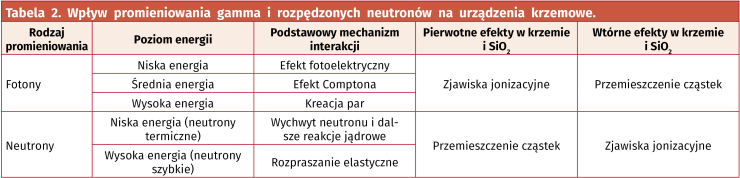 To, jaki charakter, ma dane oddziaływanie zależne jest głównie od energii i rodzaju promieniowania, które bombarduje dany układ. Oczywiście, dawka także nie jest bez znaczenia, ale kluczowym aspektem jest energia kwantów promieniowania, „atakujących” półprzewodnik. Mechanizm typowej interakcji pomiędzy półprzewodnikiem, a kwantem promieniowania jest relatywnie prosty. Rozważmy typowy tranzystor polowy. Głównymi materiałami, z jakich składa się taki element są półprzewodnik (krzem) i izolator kanału (typowo dwutlenek krzemu). Rozważmy również dwa rodzaje promieniowania – jeden, pod postacią wysokoenergetycznych fotonów (np. promieniowanie gamma), a drugi pod postacią rozpędzonych neutronów. W tabeli 2 podsumowano różne mechanizmy interakcji.