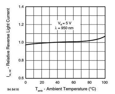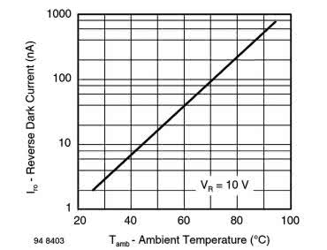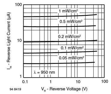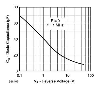 Przykładową charakterystykę popularnej fotodiody BPW34 pokazano na rysunku 24 - z początkowych 70 pF pojemność spada czterokrotnie już przy napięciu zaporowym równym 10 V. Podkręcanie napięcia - rzecz jasna w bezpiecznych dla fotodiody granicach - nie ma jednak większego znaczenia dla jej czułości (fotoprąd w niewielkim stopniu zmienia się w funkcji VR - rysunek 25).