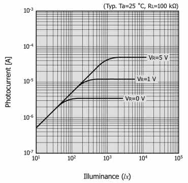 Praca w trybie fotoprądu ma także jeszcze inną zaletę, krytycznie istotną dla precyzyjnych układów pomiarowych - zapewnia bowiem lepszą liniowość niż w przypadku trybu fotowoltaicznego, choć na górną granicę zakresu liniowego ma wpływ nie tylko wartość napięcia zaporowego (rysunek 26), ale także - choć zwykle w mniejszym stopniu - szereg innych czynników, w tym rezystancja obciążenia złącza i szeregowa rezystancja zastępcza samej fotodiody.