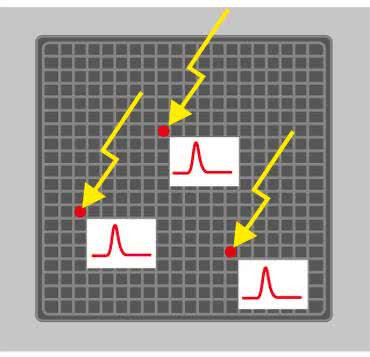 Tak powstałe gałęzie zostają natomiast spięte równolegle pomiędzy dwoma wspólnymi wyprowadzeniami (rysunek 19), tworząc system przypominający z wyglądu matrycę aparatu fotograficznego, jednak (z uwagi na wspólne połączenie wszystkich pikseli) nie nadającą się do obrazowania. Cel zastosowania takiej konstrukcji jest bowiem diametralnie inny - pojedyncze komórki macierzy są w stanie równocześnie wykrywać padające nań fotony, zaś (w przybliżeniu jednakowe) parametry elektryczne każdej gałęzi sprawiają, że jednoczesne wykrycie wielu fotonów (rysunek 20) jest widoczne dla współpracującego z MPPC układu jako impuls o amplitudzie stanowiącej wielokrotność impulsu jednostkowego (tj. powstałego dla pojedynczego fotonu) - fotografia 25.