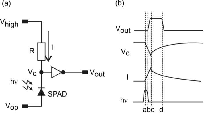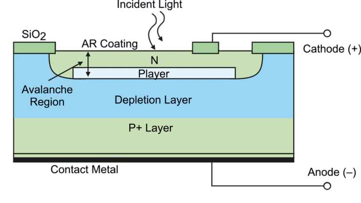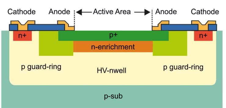 Jednym z rozwiązań tego problemu są tzw. jednofotonowe diody lawinowe (SPAD od Single Photon Avalanche Diode - rysunek 16). Jak sama nazwa wskazuje, zostały one dostosowane właśnie do detekcji pojedynczych fotonów i stanowią „rozszerzenie” kategorii diod lawinowych (APD). W tym przypadku jednak kluczowe znaczenie dla działania fotoelementu ma współpracujący z nim układ elektroniczny, wykraczający (pod względem funkcjonalnym) daleko poza sam tylko wzmacniacz. Konstrukcja fotodiod SPAD jest zoptymalizowana pod kątem jeszcze większej wytrzymałości napięciowej w porównaniu do APD - zasilenie elementu napięciem znacznie przewyższającym próg przebicia powoduje, że w obszarze zaporowym panuje bardzo silne pole elektryczne. Pojawienie się nawet pojedynczego nośnika ładunku wyzwala gwałtowny efekt lawinowy, przyjmujący postać impulsu prądowego o bardzo krótkim czasie narastania (zbocze rzędu kilkuset pikosekund) i amplitudzie na poziomie miliamperów (!).