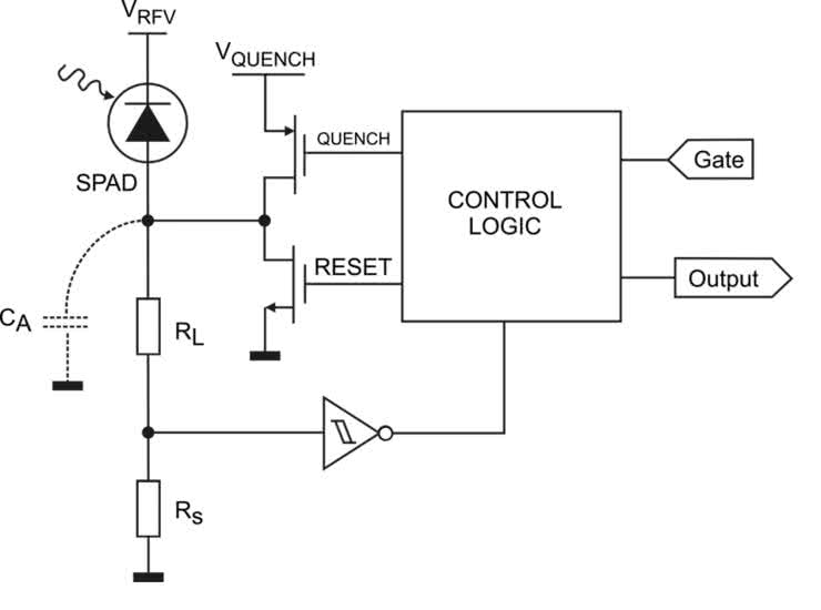 Zasada działania układu bazuje na bardzo prostym założeniu - w momencie ciszy fotonowej (braku kwantów promieniowania uderzających w strukturę detektora) praktycznie pełne napięcie (z pominięciem spadku na rezystorze R, spowodowanego prądem upływu) panuje na fotodiodzie - w ten sposób zostaje ona uzbrojona, czyli przygotowana do akwizycji fotonu. Niemal natychmiast po jego wykryciu następuje efekt lawinowy, który gwałtownie zwiększa natężenie prądu zaporowego (I), co skutkuje obniżeniem napięcia w węźle Vc, monitorowanym przez front-end wejściowy (w tym przypadku schematycznie pokazany jako negator). Spadek napięcia na rezystorze powoduje natychmiastowe ograniczenie prądu zaporowego i zapoczątkowanie eksponencjalnego spadku natężenia do bezpiecznej wartości. Takie ujemne sprzężenie zwrotne dosłownie nic nie kosztuje (przynajmniej od strony BOM urządzenia), ale ma jedną zasadniczą wadę - bardzo długa stała czasowa (rzędu mikrosekund, co w kwantowym świecie i przy możliwości wykrycia momentu akwizycji fotonu z rozdzielczością rzędu pikosekund wydaje się wiecznością) wymaga odczekania na ponowne uzbrojenie układu, a w tym czasie fotodioda będzie niezdolna do wykrycia kolejnych kwantów promieniowania.