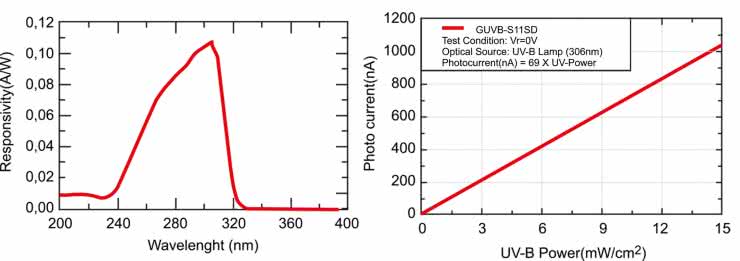 Osobną grupę stanowią fotodiody Schottky’ego - ich niewielkie (fotografia 23) i bardzo szybkie (zdolne do pracy w paśmie wielu GHz) struktury opierają się na złączu półprzewodnika (np. AlGaN) z metalem (rysunek 14) i są czułe szczególnie na promieniowanie o mniejszej długości fali - liniowa odpowiedź, mierzona przyrostem prądu w funkcji natężenia padającego światła UV (rysunek 15) sprawia, że doskonale nadają się m.in. do pomiaru wskaźnika promieniowania nadfioletowego.