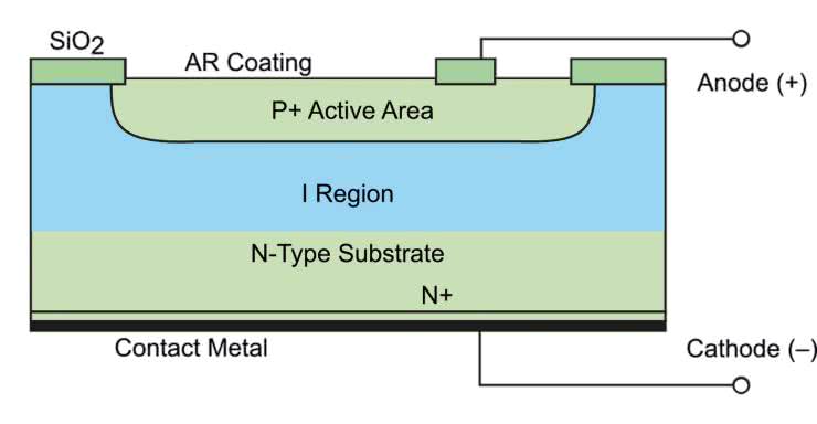 Proste fotodiody P-N zostały w znacznej mierze wyparte przez nowocześniejsze fotodiody PIN, w których obszary przeciwnie domieszkowanego półprzewodnika są przedzielone dość szeroką warstwą półprzewodnika samoistnego lub bardzo słabo domieszkowanego (rysunek 12). Takie rozwiązanie znakomicie poprawia najistotniejsze parametry użytkowe fotodiody - zmniejsza pojemność złącza, co wpływa na wzrost maksymalnej częstotliwości przenoszonych sygnałów i skraca czas reakcji, a dodatkowo (z uwagi na wysoką rezystywność warstwy środkowej, czyli obszaru I) obniża wartość prądu upływu, nawet w warunkach zwiększonego (oczywiście w bezpiecznych dla elementu granicach) napięcia zaporowego.
