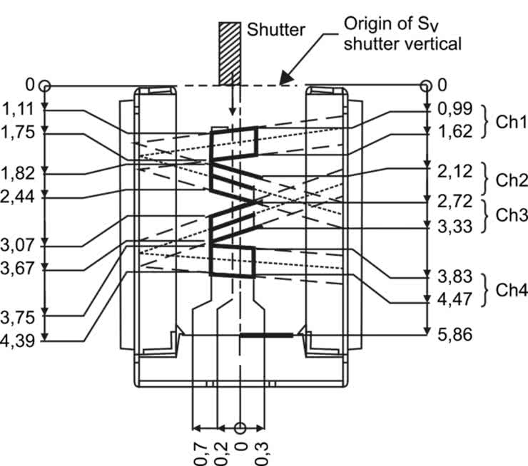 Przykładowo, układy TCUT1800X01 o wymiarach zaledwie 5,7×5,9×7,1 mm (fotografia 16) mają dwie pary częściowo skrzyżowanych torów optycznych, przy czym każdy z dwóch nadajników podczerwieni współpracuje z dwoma własnymi fototranzystorami, co daje cztery niezależne kanały optyczne (rysunek 10), umożliwiające realizację enkoderów absolutnych o rozdzielczości do 16 kroków (4 bity).