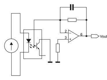 Co ciekawe, znacznie rzadziej można spotkać się z zastosowaniem… wzmacniacza transimpedancyjnego (TIA) - choć układ ten jest kojarzony głównie z fotodiodami, to praktyka (podobnie zresztą, jak teoria) pokazuje, że jego użycie w układach tranzystorowych ma spory sens. Zalecana konfiguracja układowa (rysunek 4), którą można znaleźć w dokumencie Faster Switching from Standard Couplers marki Vishay, dotyczy niestety tylko transoptorów, mających wyprowadzenie bazy - w tym przypadku zastosowane podłączenie do odwrotnie spolaryzowanego złącza baza-kolektor (a nie, jak można byłoby się spodziewać, obwodu kolektor-emiter) pozwala znacząco zredukować czasy narastania i opadania sygnału do poziomu nieosiągalnego za pomocą klasycznego układu dzielnika napięcia.