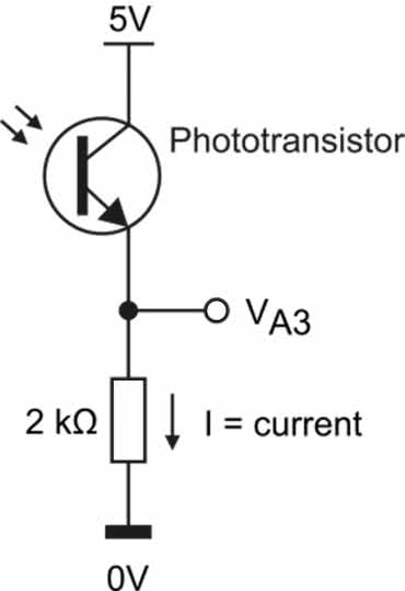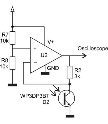 Nieco bardziej rozbudowany układ, ustalający punkt pracy fototranzystora na wartość równą połowie napięcia zasilania (choć można ją w razie potrzeby dostosować), pokazano na rysunku 8.