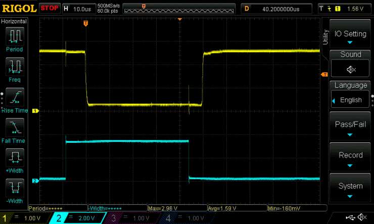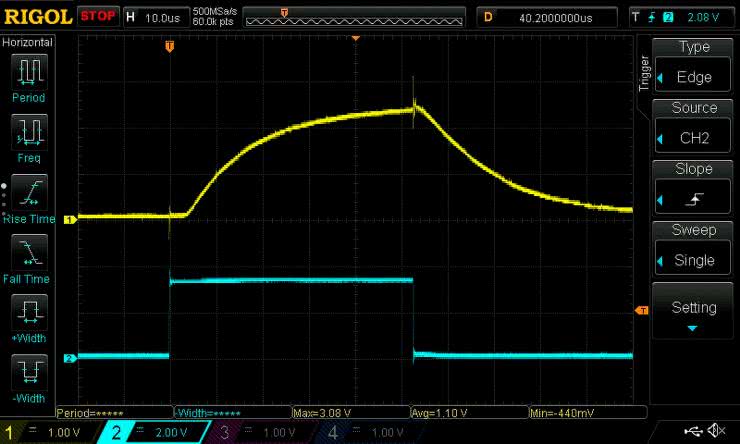 Na szczęście, pracując z fototranzystorami dwukońcówkowymi (lub czujnikami hybrydowymi zbudowanymi na ich bazie), nie jesteśmy skazani na boleśnie powolne zbocza sygnałów. W praktyce układ TIA można z powodzeniem zastosować także z takimi fotoelementami, a osiągane w ten sposób efekty mówią same za siebie - dość spojrzeć na oscylogramy, pokazujące sygnały wyjściowe dzielnika z rezystorem 2 kΩ (rysunek 5) oraz wzmacniacza transimpedancyjnego z opornością sprzężenia zwrotnego o dokładnie tej samej wartości (rysunek 6).