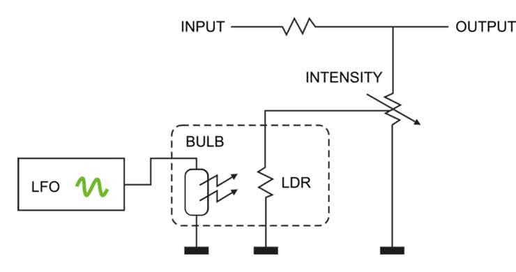 Co ciekawe, fotorezystory znalazły także diametralnie różne zastosowanie - na tych właśnie elementach bazuje bowiem konstrukcja analogowego efektu tremolo, stosowanego m.in. w niektórych „piecach” gitarowych. Fotorezystor, włączony w tor kształtowania dźwięku, tłumi brzmienie gitary w rytm sygnału optycznego, otrzymywanego z oświetlacza (np. miniaturowej żarówki), sterowanego przez oscylator niskiej częstotliwości - LFO (rysunek 2).