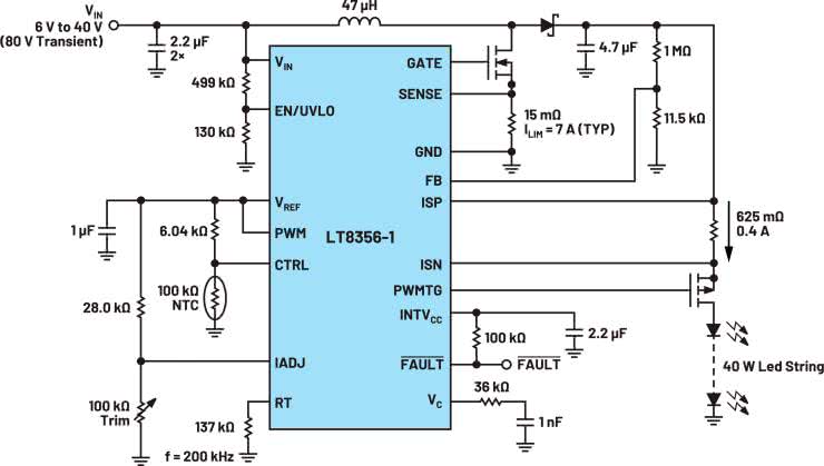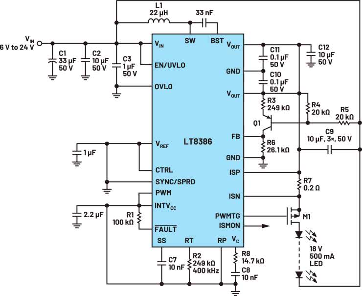 Na rysunku 3 został pokazany schemat blokowy przetwornicy typu step-up. Na rysunku 4 pokazano schemat przetwornicy na bazie układu LT8356. Tu również znajduje się klucz po stronie wysokiego napięcia w celu sterowania prądem diod połączonych szeregowo.
